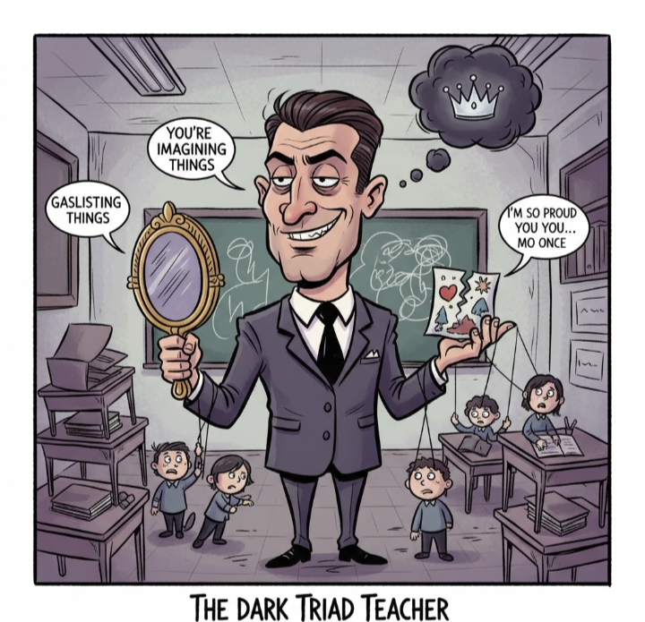 Karakteristik kepribadian yang dikenal sebagai "Dark Triad"—gabungan antara Narsisme, Psikopati, dan Machiavellianisme—merupakan tantangan serius, terutama ketika sifat-sifat ini muncul pada figur otoritas seperti guru. Guru dengan karakter ini dapat menggunakan biologi psikologis yang halus, yang berdampak besar pada kesehatan mental dan lingkungan belajar siswa maupun rekan kerja.