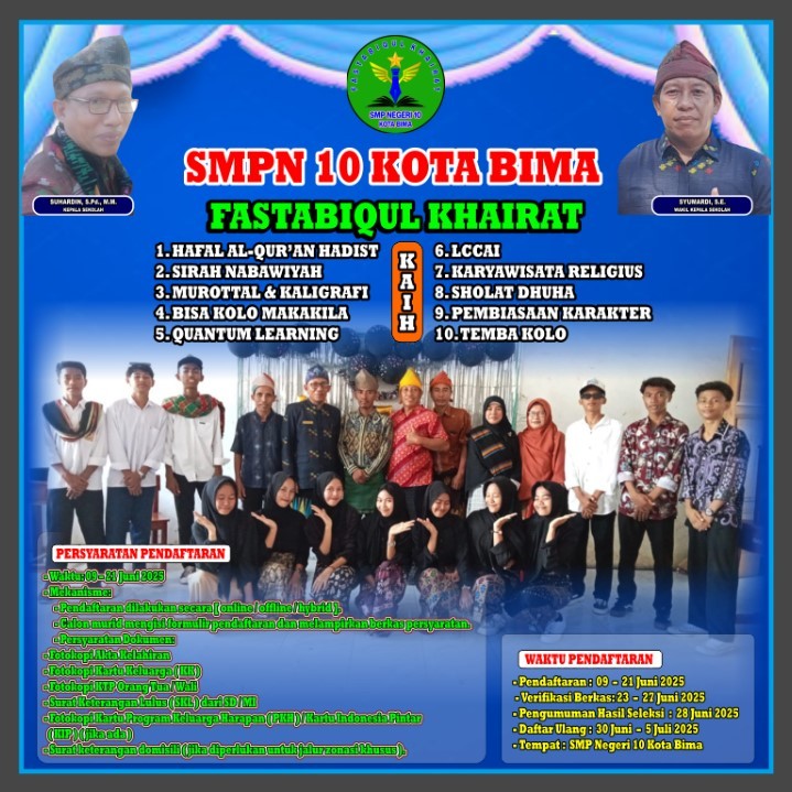 Kami mengimbau orang tua/wali untuk mengikuti seluruh rangkaian proses dan jadwal yang telah ditetapkan. Informasi lebih lanjut dapat ditanyakan langsung kepada Panitia SPMB SMPN 10 Kota Bima di sekolah.